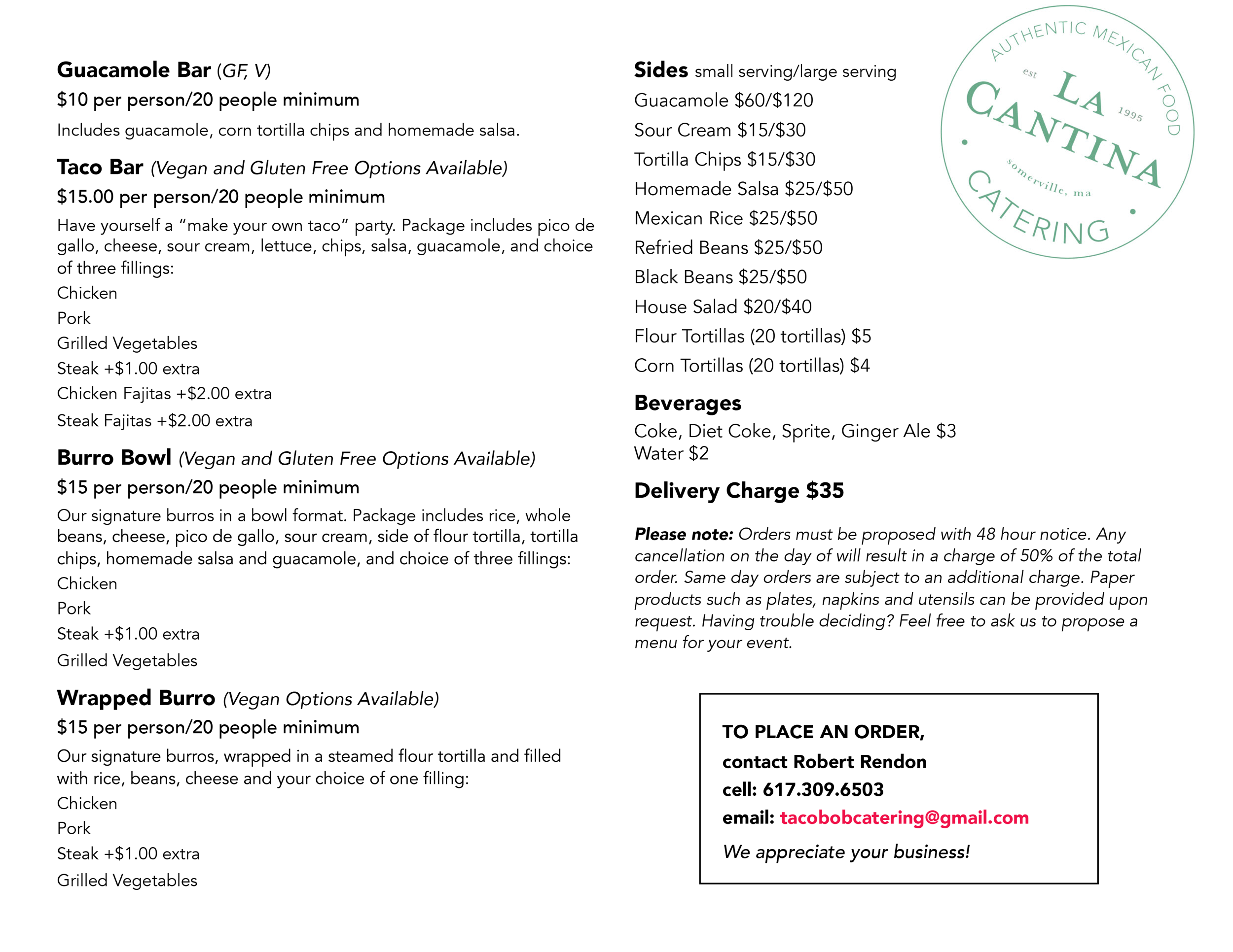Since opening in 1995 La Cantina has been serving Somerville and the Greater Boston area authentic Mexican food. Our dishes are always prepared with fresh organic ingredients. We always accomodate our customers and satisfy their dietary needs, such as offering vegan and gluten free options. At La Cantina we care to provide our customers with the best experience.